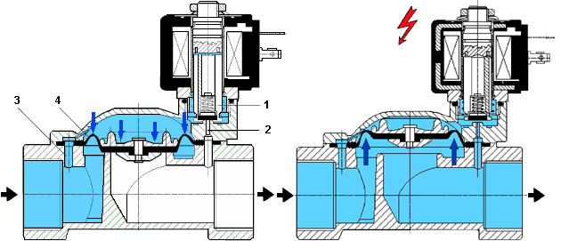 При подаче питания на катушку плунжер втягивается вверх, открывая сбросной канал. Среда из надмембранной полости через сбросной канал поступает в выходной патрубок клапана. Давление в надмембранной полости падает. Результирующая сила направлена вверх. Мембрана поднимается, открывая основное отверстие для движения среды от входного патрубка к выходному.