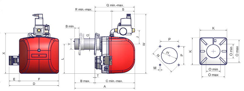 Все механические части смонтированы на одной опорной плите, съемной, что гарантирует легкий доступ к любой детали при обслуживании горелки; положение головки сгорания горелки легко регулируется с помощью градуированного винта, и, в частности, коробка всасывания воздуха позволяет держать уровень шума в установленных пределах.